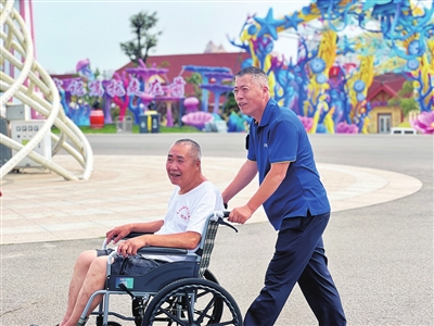 李本强(右)带着裴亚南到金沙滩啤酒城游玩。真情巴士供图
