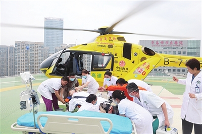 导航地图显示两地陆地最近距离130公里,车程需要1小时45分钟,“空中120”成为唯一希望。演练中,青岛市市立医院立即与青岛市急救中心取得联系,申请航空救援,青岛市急救中心立即申请航线,并决定通过直升机将青岛市市立医院ECMO救治小组送至莱西。12时55分,在ECMO救治小组的陪护下,患者被顺利转运至直升机。13时30分许,患者抵达青岛市市立医院东院区停机坪,接机小组快速奔向飞机,通过专用电梯将患者迅速转运至急诊室。早已待命的多学科MDT救治团队立即展开会诊并确定救治方案,随即患者被送往导管室,在ECMO支持下接受手术。130公里的距离,全程仅用时35分钟,航空救援与ECMO,为生命赢得了宝贵时间,青岛市市立医院ECMO团队首次亮相“空中救援”取得成功。