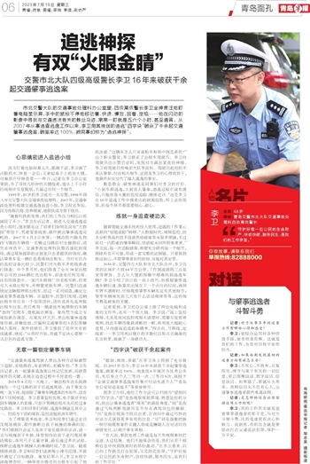 勤恳敬业、破案神速是同事们对李卫的评价。“小到车损逃逸,大到伤人肇事,追逃过程中没有捷径,只能依靠大量的监控追踪、摸排走访。”这是李卫在16年追逃工作中摸索出的破案经验,听上去很简单,但每个环节都需要细心、耐心。