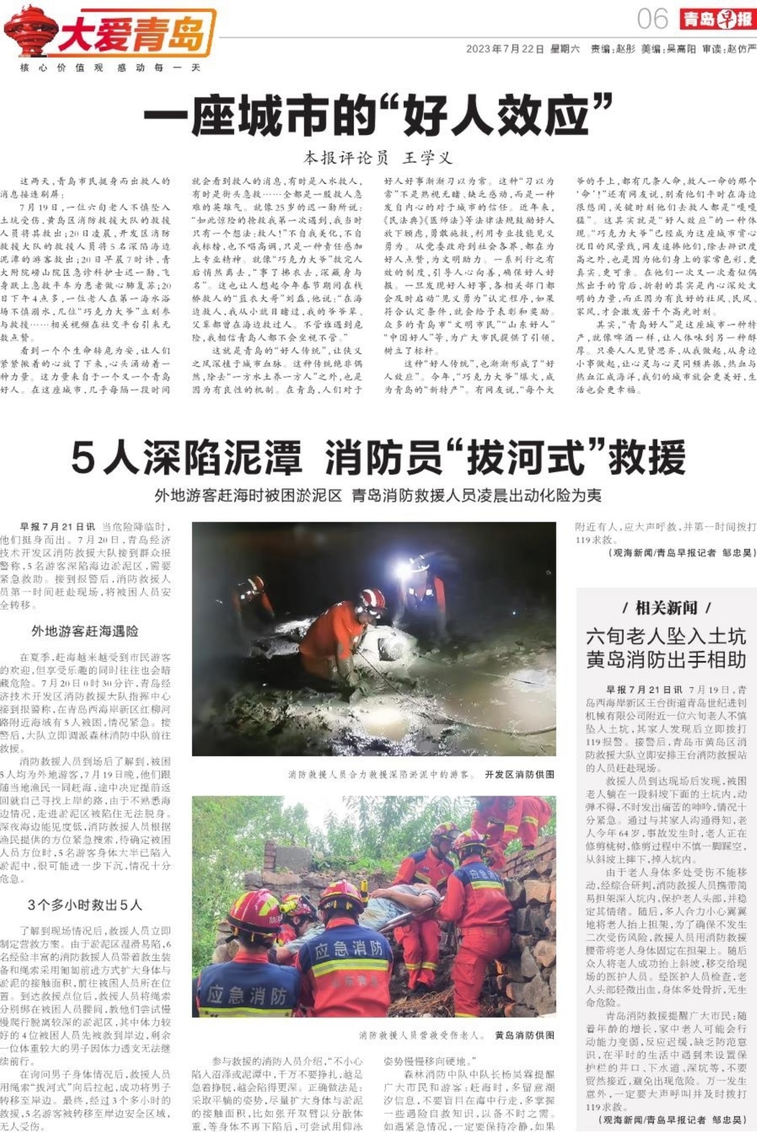 5人深陷泥潭 消防员“拔河式”救援