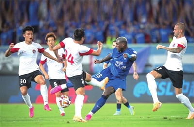 武汉三镇队球员马尔康(右二)在比赛中射门。新华社发