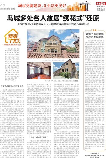 青岛是文化名人的福地,康有为、老舍、沈从文、梁实秋、闻一多、臧克家……这些名人都曾在青岛生活过。名人故居作为历史遗存中珍贵的人文资源,是城市的历史文脉和灵魂,成为青岛发展变革的见证。近日,记者从市北区了解到,随着市北区历史城区更新的推进,许多百年老建筑经过一系列“绣花式”还原,焕发生机。目前,位于市北区历史城区内的王度庐故居、王垿故居的改造修缮工作正在紧张有序进行中,陆续进入收尾阶段。