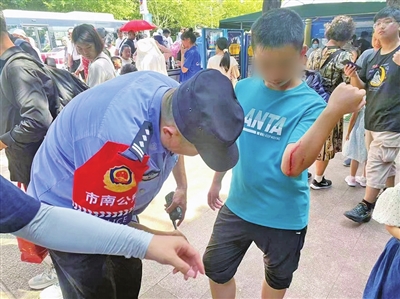 来自重庆的游客范晴一家,于7月31日抵达青岛,想趁着两个孩子放假享受一场美好的海滨之旅。“8月1日上午,我们准备去海底世界参观,在进景区大门之前发现周边的海景十分漂亮,就决定先去海边拍一下照片。结果没想到,儿子脚下一滑,在礁石上摔倒了,左侧小臂和左脚都被划破了,伤口又长又深,流血不止。”范晴的儿子今年12岁,正是好动的年纪,手臂受了伤硬是忍着一声疼都没喊,但是范晴又心疼又着急。海底世界景区周围的路况十分复杂,恰逢旅游旺季,又是条单行线,范晴在手机上尝试了很久都没有叫到网约车和出租车,正在焦急之时,她发现了正在此处执勤的警察。