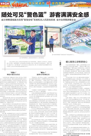 大海、啤酒、浪花,在青岛西海岸新区金沙滩啤酒城,人潮涌动、热闹非凡,巡游表演、灯光焰火、体育赛事、文艺表演等活动轮番上演,让这里成为狂欢的海洋。滚滚人潮中,随处可见一抹“警色蓝”,时时刻刻关注着流动的人群,守卫着城中的璀璨繁华和欢声笑语,让来自世界各地的游客颇为安心。