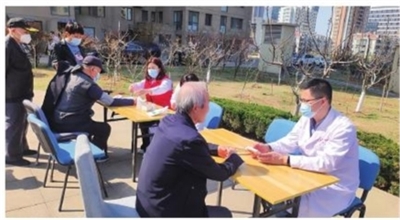 医生在义诊活动中为军休干部服务。