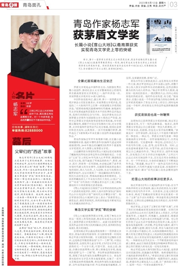 《雪山大地》获得茅盾文学奖,实现了青岛文学在这一奖项上的零的突破,杨志军也成为山东文学史上获得茅盾文学奖的第四人。此前3位获奖作家及其作品分别为刘玉民的《骚动之秋》、张炜的《你在高原》、莫言的《蛙》。