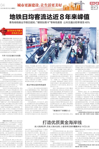 早报8月24日讯 石老人海水浴场每周翻沙3次、上百名保安24小时巡逻、冲脚装置首次30秒内免费……记者从崂山区举行的媒体见面会上得知,今年以来,崂山区城市管理局精细化管理滨海一线,统一规划设计、统一运营管理,导入更多高端新兴业态,打造优质黄金海岸线。进入旅游旺季,石老人海水浴场接待量达290.2万人次,小麦岛接待量达117万人次,两景区单日接待量最多达14万人次。