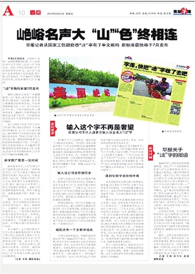 可喜的是,最新版《信息技术 中文编码字符集》于今年8月1日正式实施,其中“山色(shuǐ)”字也被纳入其中……经过早报记者的不懈努力与多方推动,“山”“色”二字终于相连。