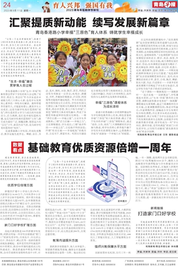 “让每一个生命幸福绽放”,始建于1903年的青岛香港路小学,前身为浮山所小学,至今已有120年历史。在这样一所百年传承、创新发展的“有责任、有活力、有品位”的幸福校园里,学校不断深化课程改革,扎实推进核心素养校本化实施,架构起幸福“三原色”育人体系,激发每一个学生的生命成长活力,让每一个学生在享受幸福童年的同时,储备下为自己和社会创造幸福的能力;让每一位教师在成全学生的同时,成就自身的专业发展和职业幸福;让学校成为师生幸福成长的精神家园。