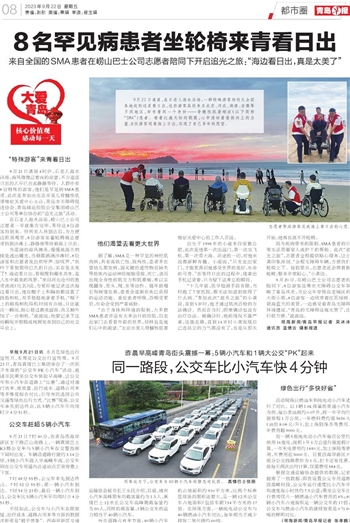 9月21日清晨4时许,石老人海水浴场,海风微微泛着夜的凉意,不少追逐日出的人早已在此静静等待。人群中有8位特殊的游客,他们是罕见病SMA患者,此次是参加由北京市美儿脊髓性肌萎缩症关爱中心主办,青岛市无障碍促进协会、青岛城运控股公交集团崂山巴士公司等单位协办的“追光之旅”活动。