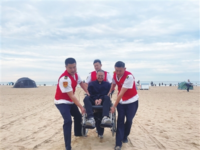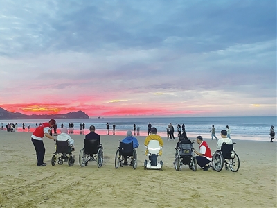 在石老人海水浴场,崂山巴士公司志愿者一早就集合完毕,等待这8位游客的到来。待所有人员到达后,为方便近距离观赏,8位游客坐着轮椅被志愿者抬到沙滩上,静静地等待着海上日出。