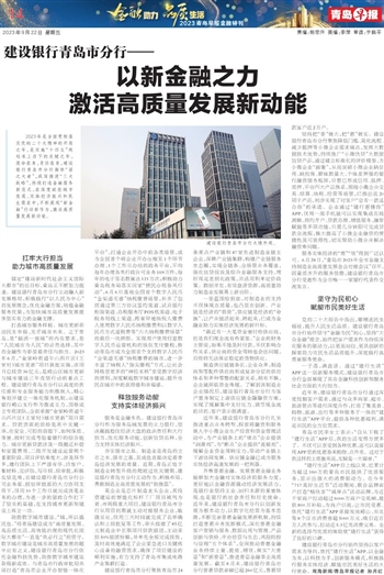 2023年是全面贯彻落实党的二十大精神的开局之年,是实施“十四五”规划承上启下的关键之年,使命在身,责任在肩,建设银行青岛市分行胸怀“国之大者”,纵深推进“三大战略”,持续打造金融服务新范式,在深度赋能城市发展、实体经济振兴和民生需求中,不断展现“新金融”行动新作为,激活高质量发展新动能。
