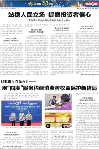 日照银行青岛分行坚持以人民为中心的发展思想,聚焦日常生活涉及的服务场景和高频事项,坚持传统与创新同频共振的服务宗旨,以“有深度、有精度、有速度、有温度”的四度服务建设,构建消费者权益保护新格局。