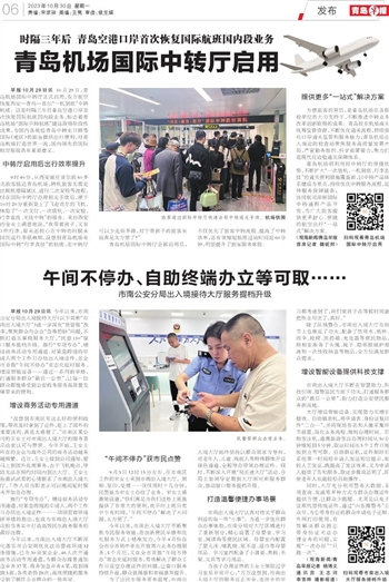 早报10月29日讯 今年以来,市南公安分局出入境接待大厅(以下简称“市南出入境大厅”)进一步深化“放管服”改革,聚焦群众与企业“急难愁盼”问题,不断打造五星级服务大厅,“民意110”窗口服务提档升级。推行“专项专办”、增设商务活动专用通道、对紧急跨境的申请人两个工作日办结出入境证件、在全市首推“午间不停办”常态化延时服务、增设智能设备……通过一系列新举措,打通服务群众“最后一公里”,让每一位群众都能感受到公安政务服务高质量发展带来的便利。
