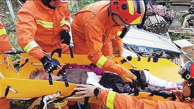 消防救援人员营救、转移坠崖老人。