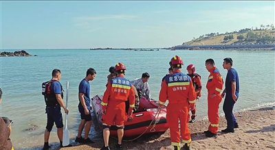 接到救援警讯后,银川路消防救援站救援人员立刻携带舟艇和救生设备赶到现场。救援人员致电被困人员让他们保持冷静配合救援,随后寻找救援路径。救援人员发现,潮水上涨较快,岸边及水下礁石较多且暗流涌动。为避免舟艇出海时遭遇搁浅,救援人员穿戴好防护装备后徒步涉水,走出一段距离后,再将舟艇投送至海中。
