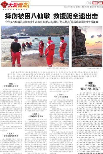 秋高气爽,凉风习习,爬山看看风景,是不少人钟爱的休闲娱乐方式。但很多人登山不走寻常路,总想探寻景区未开发景点,导致意外发生。近日,3名游客游玩崂山,却“另辟蹊径”走野路打卡八仙墩,其中一人不慎失足摔伤。青岛红十字搜救队队员经过2个多小时努力,在海上开辟“生命通道”,将伤者安全转移。记者了解到,今年发生在八仙墩的应急救援已多达8起。救援人员提醒广大市民和游客,野游景点因未经开发,存有一定的风险,大家一定谨慎前往,一旦遭遇危险应第一时间报警求助。