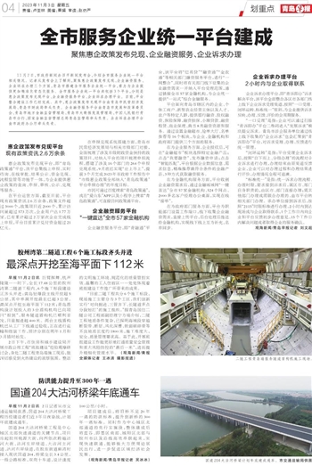11月2日,市政府新闻办召开新闻发布会,介绍全市服务企业统一平台相关情况。记者从发布会上了解到,聚焦惠企政策发布兑现、企业融资服务、企业诉求办理三个方面,青岛市搭建全市服务企业统一平台,着力为企业提供更加精准化常态化服务。全市服务企业统一平台共包括3个平台,分别是惠企政策发布兑现平台、企业融资服务平台、企业诉求办理平台。目前,平台整合建设工作已经完成。其中,惠企政策发布兑现平台由青岛市民营经济发展局、青岛市财政局牵头负责。企业融资服务平台由青岛市发展和改革委员会、青岛市地方金融监督管理局、青岛市大数据发展管理局、中国人民银行青岛市分行、国家金融监督管理总局青岛监管局牵头负责。企业诉求办理平台由市政府办公厅牵头负责。