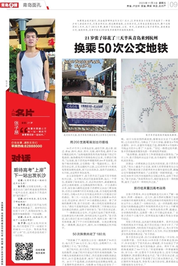 如果想去杭州旅行,你会选择哪种出行方式?近日,21岁的青岛小伙张子昂选择了一种很少有人尝试的方式,引发全网关注:通过换乘地铁、公交的方式,从青岛出发抵达杭州,整个过程历时三天半,花了180元车费,换乘了50次地铁、公交。昨天,记者联系上张子昂得知,喜欢乘坐公交、地铁的他,还曾手绘过200余张多座城市的地铁线路图。