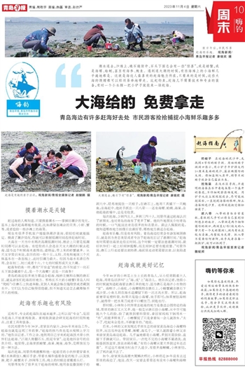 赶海有乐趣,但是也有风险。青岛海边经常会有游客被困礁石,就是因为贪恋美景或者专注于赶海而忘记了涨潮时间。“赶海有时需要往海里走很长时间,这个时候一定要注意涨潮时间,最好伙伴们一起上好闹钟提醒,而且闹钟还要有提前量。”刘景伟说,礁石上行走还要注意防滑,海泥里走动更需要注意,以免陷进去。