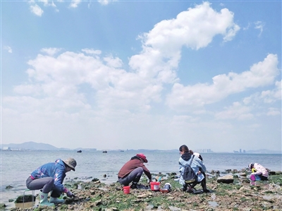 今年40岁的小林是土生土长的青岛人,从小经常跟着大人赶海,用青岛话讲叫“上”海,或“上”海沿儿。他告诉记者,他很小的时候就知道赶海要去礁石多的地方,因为礁石是海洋小生物的“家”。海蛎子、小海虹、小海螺吸附在礁石上,小螃蟹藏在礁石下或沙里,小鱼儿则在海水退潮留下的一汪汪浅水里。所以,赶海前要带足塑料袋,如果只是捡小海螺,徒手即可;如果要抠海蛎子,就得带一把水果刀或者平口螺丝刀,钥匙也行。