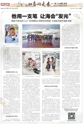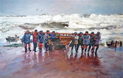 潮涨潮落,那奔涌而来的海流,虽然受到礁石的阻挡,却依然澎湃成盛开的浪花。这更像是生活给予画家的一种人生暗喻:诗意在远方,其实也在脚下。今年80岁的著名画家于普洁先生,有着“中国画海油画第一人”的赞誉。他说,自己虽然并没有直接在工厂工作,却也是一名“普通劳动者”,在部队中学习成长,退伍后先是在青岛京剧团做舞美设计工作,后来又调进青岛日报社美术摄影组,“严明的军营”“火热的工厂”“广阔的农村”等都曾是他作品的主题。几十年的岁月磨砺,他的坚持与专注为艺术事业作出了最好的诠释。