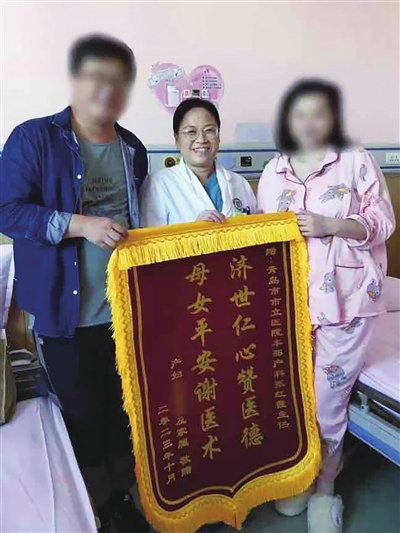 赵女士与丈夫为张红霞医生(中)送来锦旗。院方供图