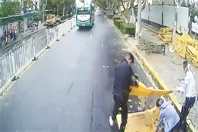 11月4日15时25分,青岛城运控股公交集团市北巴士公司367路线驾驶员张培生驾驶车辆行驶至四流南路萍乡路车站附近时,发现前方两块施工专用隔离板横在道路中间,严重影响车辆运行安全。“当时下雨风大,视线较差,隔离板在马路中央占据了一条车道,一旦避让不及,极易发生危险。”张培生告诉记者。在确保安全的前提下,他停稳车辆,打开应急双闪车灯,下车准备把隔离板抬到不影响交通的安全地带,此时两位热心市民也加入其中,他们一起将隔离板抬到路边,保障道路通畅。