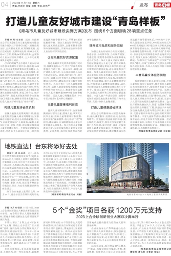 早报11月10日讯 近日,市政府办公厅印发《青岛市儿童友好城市建设实施方案》(以下简称《方案》),围绕政策友好、公共服务友好、权利保障友好、成长空间友好、发展环境友好、精神文化友好6个方面,明确28项重点任务,全面推动儿童友好型城市建设,让少年儿童健康快乐地茁壮成长。