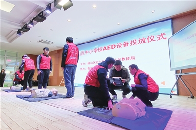 红十字志愿者现场展示AED设备使用方法。
