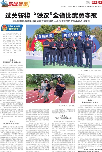 面对困难和挑战,总有一种不服输的倔强劲儿,必须拼,展现出“铁汉”的一面;面对市民的求助,热情服务,尽己所能,就算受到委屈,也会不急不躁耐心解释,展现出“柔情”的一面。11月10日,青岛早报记者采访了胶州公安局辅警纪冬成,听他讲述在全省公安机关首届辅警职业技能竞赛中夺得最小作战单元项目比赛第一名的经过,以及日常工作中的点点滴滴。
