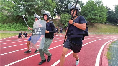 什么是“最小作战单元”?纪冬成告诉记者,就是用最少的人在最短的时间内处理好应急突发事件,考验的是协作是否默契、处置是否规范、体力是否充沛以及判断是否冷静准确。比赛中,一声令下,纪冬成和两名队友迅速戴上头盔、穿好防刺服、扎紧武装腰带并带齐对讲机、执法记录仪等被称为“八大件”的警用装备,然后快速规范地连续处置三个特殊警情。“装备加起来将近20斤重,而且穿戴取用时要‘多中选优’,要排除坏损装备,如手电缺少电池、执法记录仪内存不足,对讲机无法开机,盾牌无法正常使用等情况。”纪冬成介绍,在紧急情况之下,需保持清醒头脑并迅速作出准确判断。
