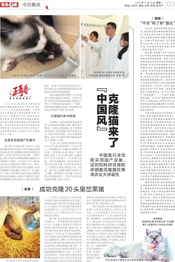 记者从青岛农业大学实验室了解到,猫体细胞克隆技术的建立,不仅有利于促进动物疾病模型和药物的开发,在生物医药领域、宠物行业和濒危物种保护方面均具有重要作用。在医药研究方面,和犬类似,猫也是重要的实验动物、疾病模型动物和伴侣动物。根据OMIA数据库最新统计,在猫科动物身上发现了361种遗传疾病,其中227种有望开发成人类同种疾病的动物模型,且猫科动物癫痫、高血脂、软骨发育不良及部分肿瘤、艾滋病等疾病的发病机制与人类尤为类似。更加受到研究人员关注的是,猫拥有与人类结构高度相似的ACE2受体,而该受体为SARS和新冠肺炎病毒感染人体的主要受体,这使得猫具有感染SARS和新冠肺炎的潜在可能。利用猫克隆技术和基因编辑技术可以大量生产携带特定疾病的个体,供医学研究和药物开发所使用。