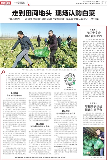 11月19日,青岛早报联合青岛市红十字会、青岛微尘公益基金会正式启动“爱心助农——认捐乡村蔬菜”项目,将联合全市各级红十字系统及爱心组织加入到助农行动中,筹集、募集善款,采购莱西、平度等地种植农户的白菜、萝卜、大葱等蔬菜,送给青岛市的社区困难家庭以及养老院、日善堂等爱心机构。青岛市红十字会已在官方网络筹款平台“博爱青岛”推出“认捐蔬菜——爱心助农”专项募捐项目,希望大家伸出援手,汇聚爱心,通过网络平台认购莱西、平度种植农户的蔬菜。