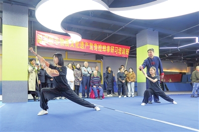 早报11月19日讯 国家级非物质文化遗产鸳鸯螳螂拳研讨会暨鸳鸯螳螂拳研习培训班在青岛鸳鸯螳螂拳传承基地举办,来自各地的鸳鸯螳螂拳传承人、弟子、学员参加。研讨会上对鸳鸯螳螂拳技法理论开展了研讨学习,学习了鸳鸯内家功行气方法和《非遗保护法》,并现场开展了技法演练。