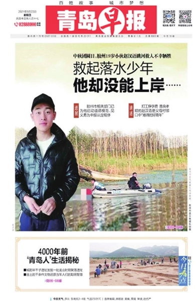 2002年3月出生的赵汉语,生前系胶州市铺集镇盛家庄村村民。他先后获得青岛市“文明市民”、“感动青岛”道德模范、胶州市见义勇为先进分子(先进群体)、“最美胶州人”等荣誉称号。2021年9月21日下午3时许,3名初中生沿着胶州市铺集镇盛家庄村东的胶河游玩,其中一人不慎滑入深水区。正在旁边钓鱼的赵汉语来不及多想,边跑边脱衣服跳入河中,迅速游到落水者旁边,拖着落水者从深水区向浅水区移动。关键时刻,赵汉语的父亲赵桂山及其他村民赶到现场,赵汉语将落水者推向众人,自己却再次滑向深水区。下午4时许,胶州市蓝天救援队携带装备赶到现场,经过一个多小时的救援,赵汉语被找到,但已无生命体征。被救少年经紧急救治后脱离危险。