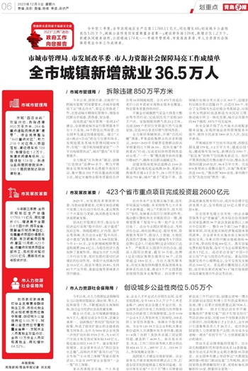 截至11月底,全市城镇新增就业36.5万人,提前完成全年任务,总量全省第一。创新推出“青岗贷”稳岗扩岗政策,形成了稳岗扩就业的全链条政策支持体系,全年为5416家企业发放一次性扩岗补助3719万元,为1.92万户市场主体发放社保补贴3.65亿元,稳定就业岗位3.95万个。就业服务扩面增效。在全省率先试点“街区创业生态圈”,高频次开展“春风行动”“民企专场”“企业用工保障”等就业服务活动,为全市1977家企业提供“一企一策”用工保障。