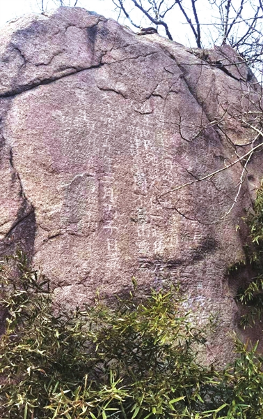 沿着竹木森森的小径,有石条铺就的石基和零散的大青砖,很容易判定这里就是华阳书院遗址。行至书院山门西侧,首先映入眼帘的是一块巨型刻石,仔细辨别,可见以下文字:“明侍郎蓝讳章资善大夫,以赠公成化丁未葬於华楼东,子蓝讳田遂卜吉华阳鉴山书屋,十六龄弘治乡薦,嘉靖会魁,为名御史。又封君蓝讳再茂,治瀛海令,方先肆业二子深、滋暨孙启先、启晃、启亮相從於此,滋,清朝首科丙戌进士。内院地灵人杰,一时雋彦代不乏人,今新建紫云阁,不负山灵云。时大清顺治十年三月丙子日识。庠生:杜大晋……”《即墨望族—蓝氏》一书记载,顺治九年,蓝再茂修缮华阳书院,重建“紫云阁”,书“重游旧地”石刻于华阳书院东。次年三月,书院读书诸师生刻石记之。刻石上已略显模糊的文字,穿越三百余年的时光,清晰地向我们讲述着书院的历史和辉煌过往。