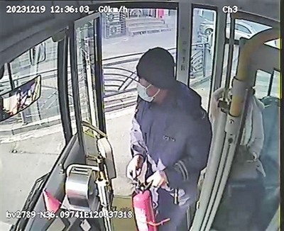 王庆刚拿着灭火器冲下车。视频截图