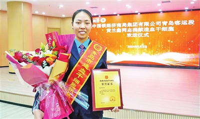 黄兰鑫是青岛客运段一名普速列车乘务员。2019年8月,20岁的她进行了人生中的第一次无偿献血。进入青岛客运段工作后,黄兰鑫多次听说劳动模范、南宁车队队长张坤聪连续25年无偿献血的动人事迹,从那时起,她便在心中立誓,决定以张坤聪为榜样,奉献青春,点燃梦想,回馈社会。