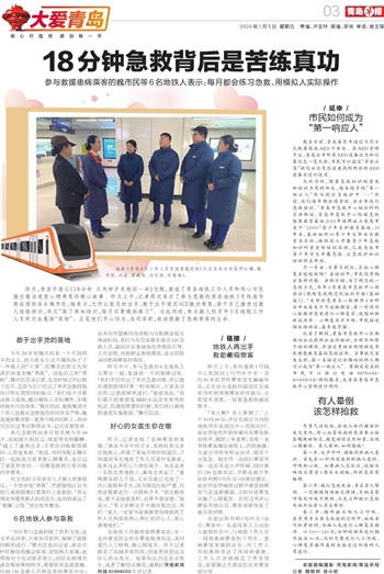 昨天,青岛早报以《18分钟 从死神手里抢回一命》为题,报道了青岛地铁工作人员和热心市民接力救治突发心梗乘客的暖心故事。昨天上午,记者再次采访了参与急救的青岛地铁3号线海尔路站值班站长魏市民,她表示,之所以能及时出手、敢于出手使用AED救治乘客,源于自己接受过救人技能培训,而且“除了参加培训,每月还要模拟练习”。与此同时,参与救人的另外5名地铁工作人员昨天也集体“亮相”。正是他们齐心协力、各司其职,成功挽救了患病乘客的生命。