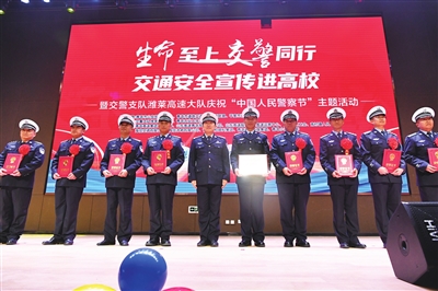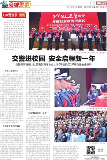 1月8日,春运将至,高校放假在即,为引导学生提高交通安全意识,平安回家,“生命至上·交警同行”交通安全宣传进高校暨交警支队潍莱高速大队庆祝“中国人民警察节”主题活动在青岛农业大学(平度校区)拉开帷幕。现场除为高校学子带来精彩的交通安全宣讲外,还成立了交警潍莱高速公路交通安全公益联盟,倡导社会各界争做文明交通的践行者、文明交通的推动者、文明交通的宣传者。