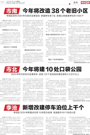 早报1月11日讯 市南区日前发布2024年为民办实事项目,共分为就业保障宜业、安全温馨宜居、品质提升宜游、教育优质均衡、医养优质提升等5类工程23个项目。
