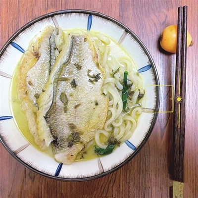“黄鱼的鲜美与面条的筋道,每一口都是对海味的最好诠释。”在青岛,不少特色面馆里都能找到黄鱼面的身影。“好的黄鱼面,第一口面汤就知道地不地道。”捞鲜小馆的面点师王师傅表示,在青岛想吃黄鱼面更是近水楼台。准备好新鲜的黄鱼切花刀,用葱、姜、蒜等调料腌制一会给鱼肉去腥。在锅中加油,将黄鱼两面煎至金黄后备用。“锅里面留底油,爆香葱姜蒜,下入雪菜一起爆香。”香气四溢,此时师傅加入煎好的黄鱼,倒入适量的水,大火烧开煮一刻钟左右。等候煮鱼的时间,师傅另起锅煮面,煮至八分熟捞出,过凉水沥干水分。将煮好的面条放入黄鱼汤中,加入生抽、糖调味,煮至面条全熟。撒上葱花,即可出锅。