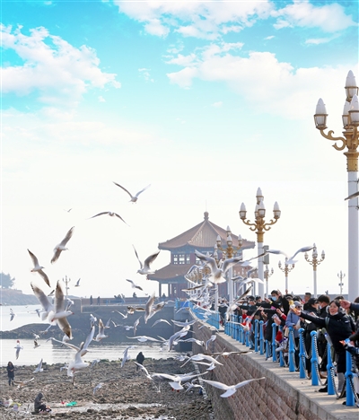 游客在栈桥上喂海鸥。观海新闻/青岛早报首席记者 孙启孟 摄