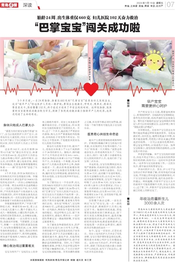 3个多月前,一名24周胎龄、体重仅660克的“巴掌宝宝”在青岛妇儿医院出生。这名“超早产儿”经过医护人员的一路护航,勇闯出生抢救关、呼吸关、喂养关、感染关等层层关卡,历经整整102天,终于在近日迎来了平安出院的时刻。这样低胎龄、低体重的宝宝能够成功救治较为罕见,刷新了医院成功救治最小胎龄早产儿的纪录,也再次创造了生命的奇迹。