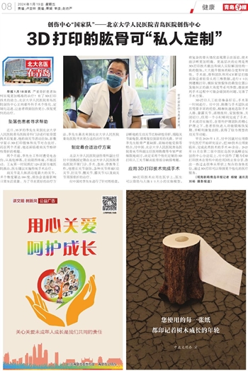 早报1月18日讯 严重骨折患者如何实现更加精准的治疗?有了3D打印技术的助力,北京大学人民医院青岛医院创伤中心正向着外科手术个性化、定制化迈进,让患者得到创伤更小、恢复更快的治疗。
