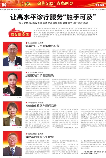 将健康体检纳入医保报销,满足人民群众的健康需求;优化完善医院分诊诊疗的工作职能,节约基层医疗资源;加大区域级医院建设,让更多市民能享受三甲级医院的高水平诊疗服务……来自医疗卫生领域的市人大代表和市政协委员就医疗相关话题进行了热烈讨论,从更好满足人民群众的健康医疗需求出发,探索推进智慧医疗建设,有效促进居民医疗健康服务便民、高效和智能的方法。