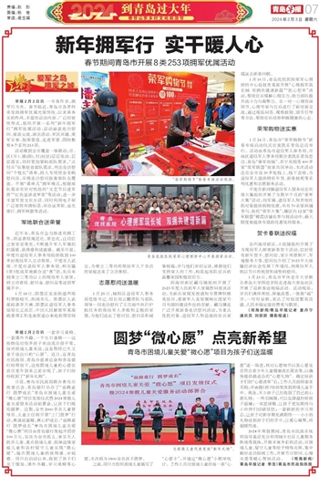 早报2月2日讯 一年春作首,拥军行为先。春节临近,青岛市各界传承发扬拥军优属光荣传统,以求真务实的作风、丰富的活动内容、广泛的宣传形式,组织开展一系列“新年拥军行”拥军优属活动,活动涵盖走访慰问、座谈交流、演出活动、军民共建、荣军实事、氛围营造、走进军营、国防教育8个系列253项。