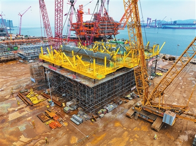 “深海一号”二期工程综合处理平台上部组块甲板片吊装。